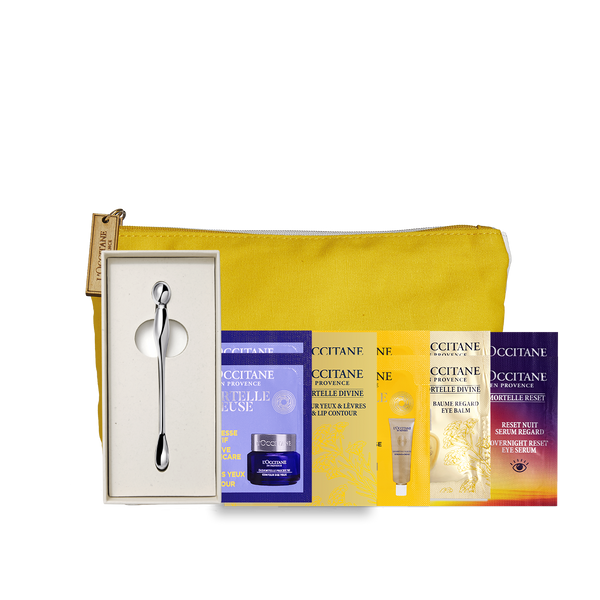 Īpaši izveidots acu zonas un kakla ādas kopšanas paraugu komplekts kosmētikas somiņā ar multifunkcionālu spatulu sniegs iespēju izmēģināt L'Occitane produktus un atrast jaunus favorītus.