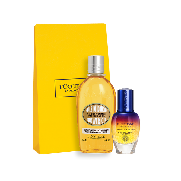 Jaudīgais Reset nakts serums sejas ādai un delikātā mandeļu dušas eļļa būs lieliska dāvana jebkuros svētkos. Komplektā ietilpst: